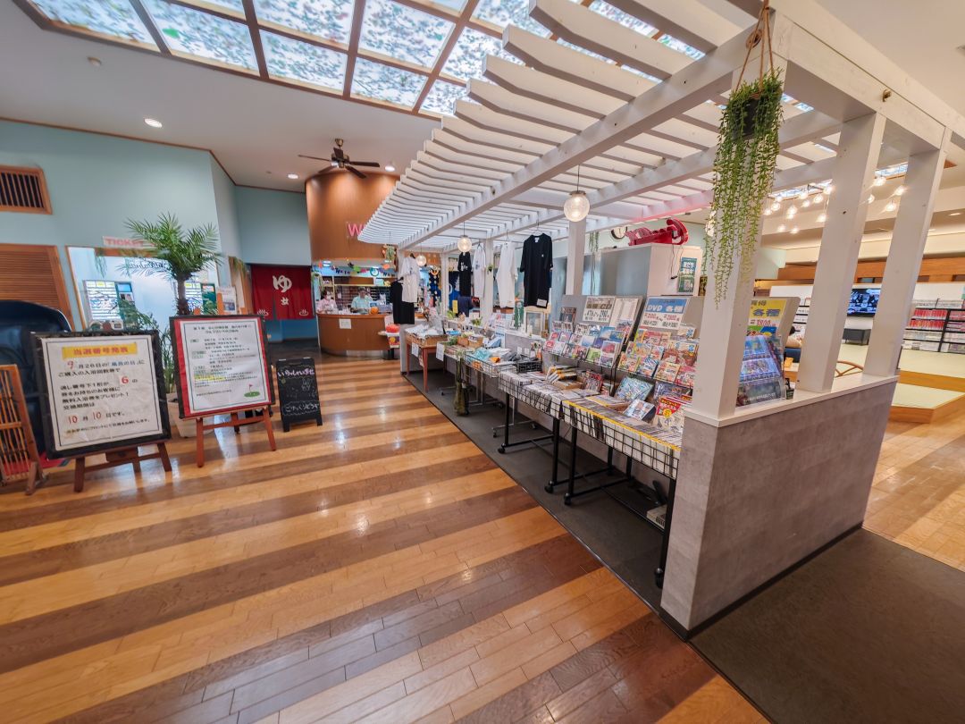 フロント前には物販があり、左手側にカットサロン、右て側に休憩処とその奥に食事処があります。
