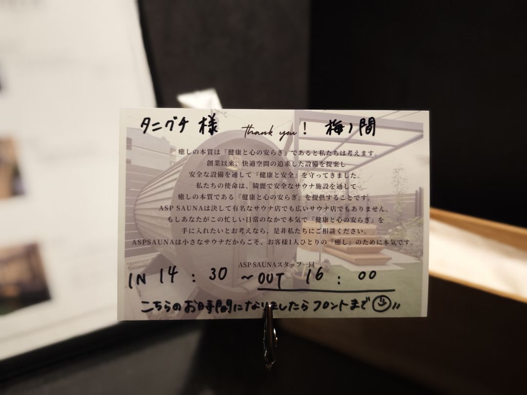 初めて来た日にお店から感じる歓迎ムードに驚きました。電話予約したときから対応が好印象でしたが、フロントでの接客、ウェルカムカードなどホスピタリティが溢れています。いつ予約しても、いつ行ってもスタッフの接客が気持ちよく、ここまでサービスがしっかりしているサウナは他にないような気がします。