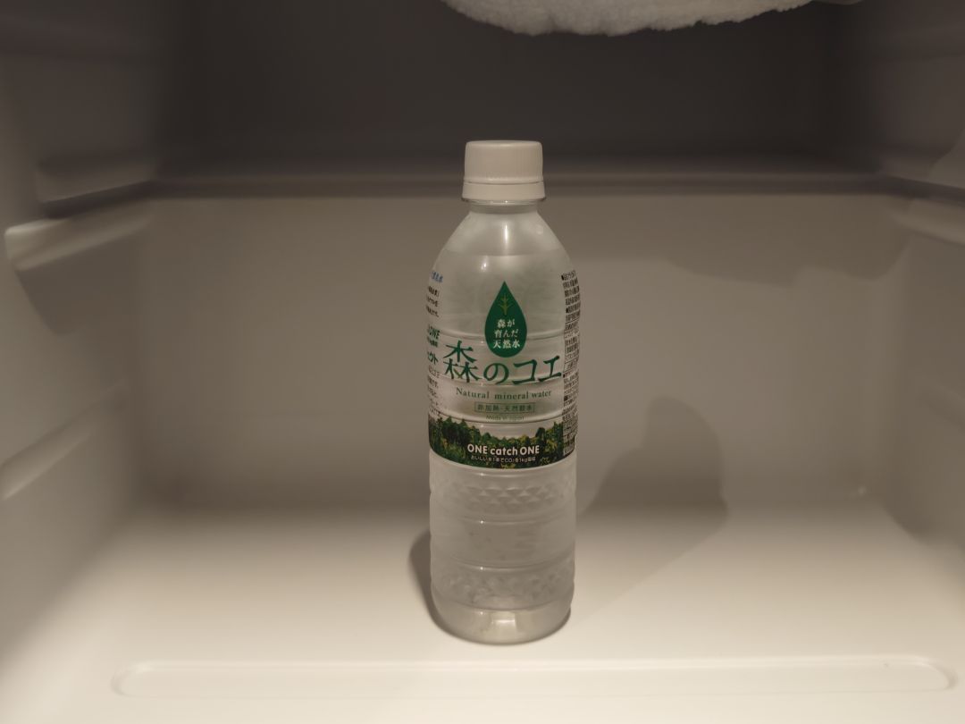 シャワーを浴びて、冷蔵庫の中の水で水分補給。ドリンクの追加注文やフロントへの連絡はこちらから。