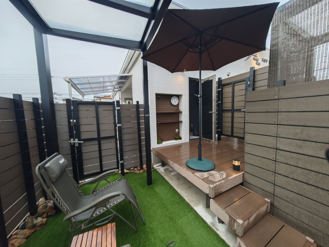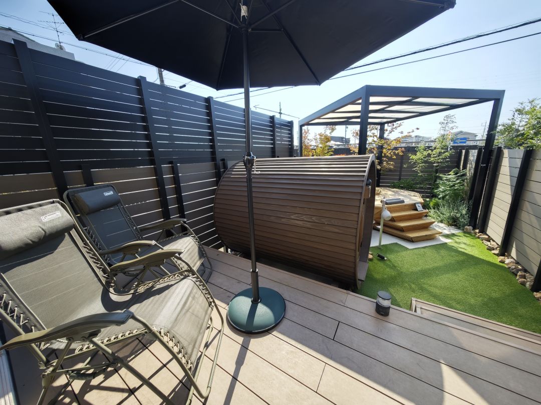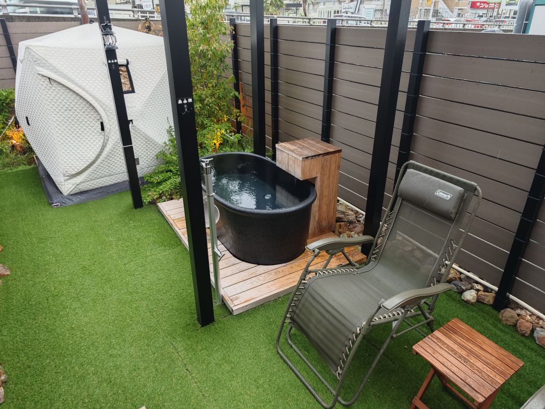 こちらもととのい椅子(インフィニティチェア)が2脚。テントサウナ→水風呂→ととのい、ノンストップで導線が確保されています。