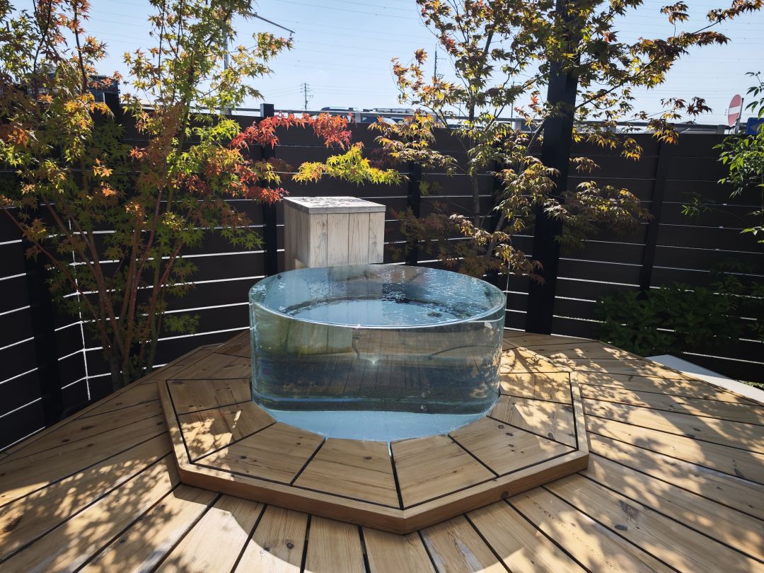 スタイリッシュなデザインで、夜はライトアップするアクリル水風呂ユニット。お洒落すぎますね。