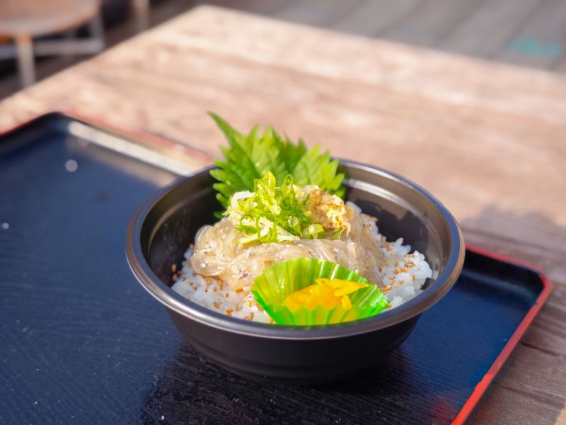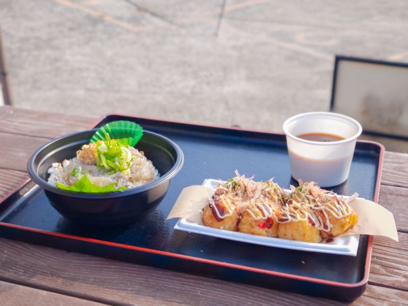 お腹が空いていたので、さっそく生しらす丼とタコ焼きを食べました。おまけで味噌汁もついてます。