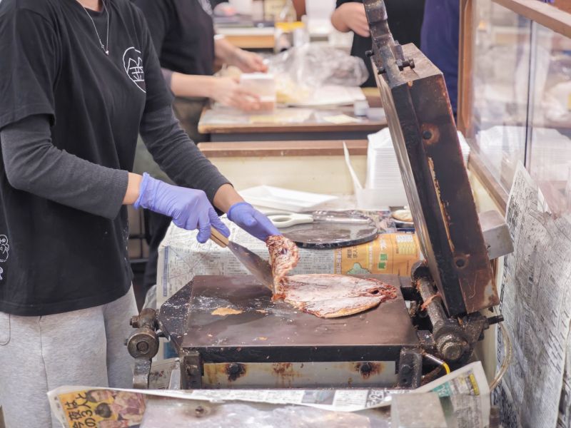 2年前はせんべいのお土産だけ買ったお店ですが、今回は店内でプレスして焼き上げるいかの姿焼きを食べました。