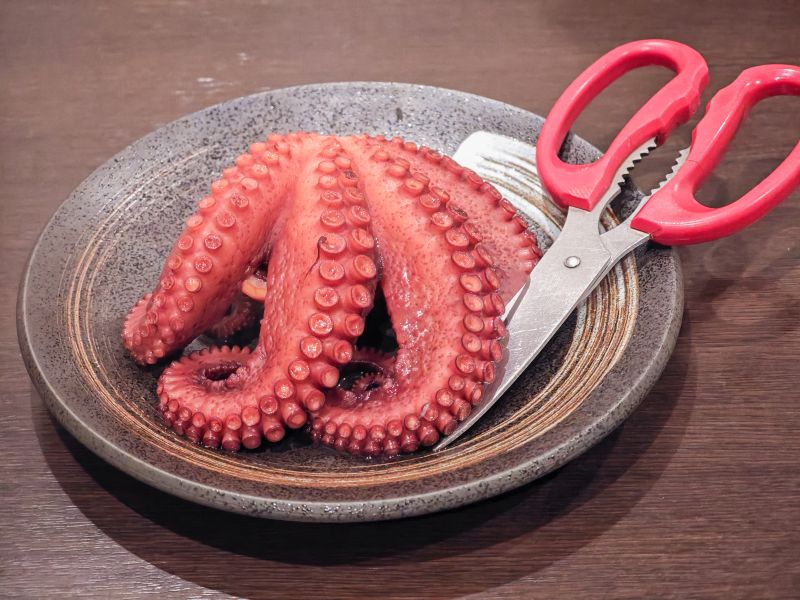 ゆでだこは味がついてるので、はさみで切ってそのまま食べます。さすが日間賀島の名産で、適度な弾力はあるのに柔らかい身で、そのまま食べるのが一番美味しい。