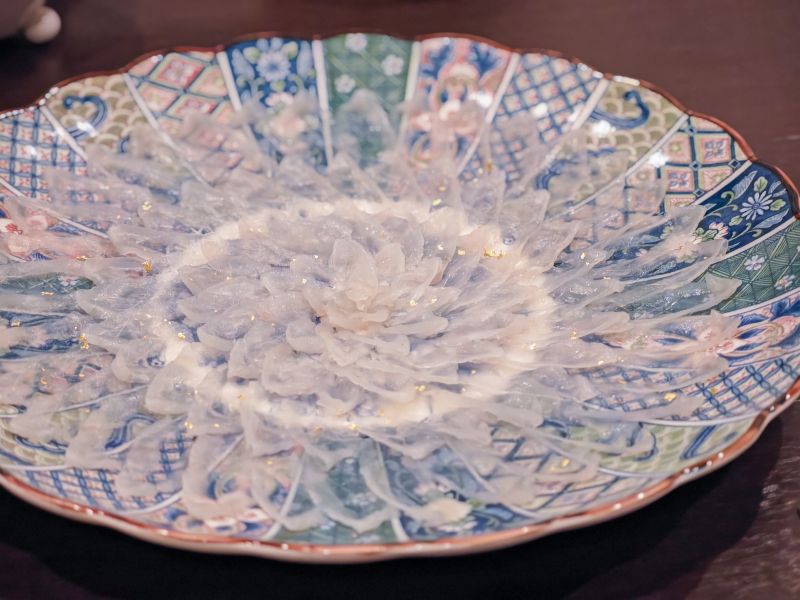 初めて食べるふぐのてっさは金箔が散らしてあって高級感すごい。かなり淡白な味で、とにかく食感が良かったです。しかしポン酢につけると、ふぐの味はどうしても負けてしまいますね。