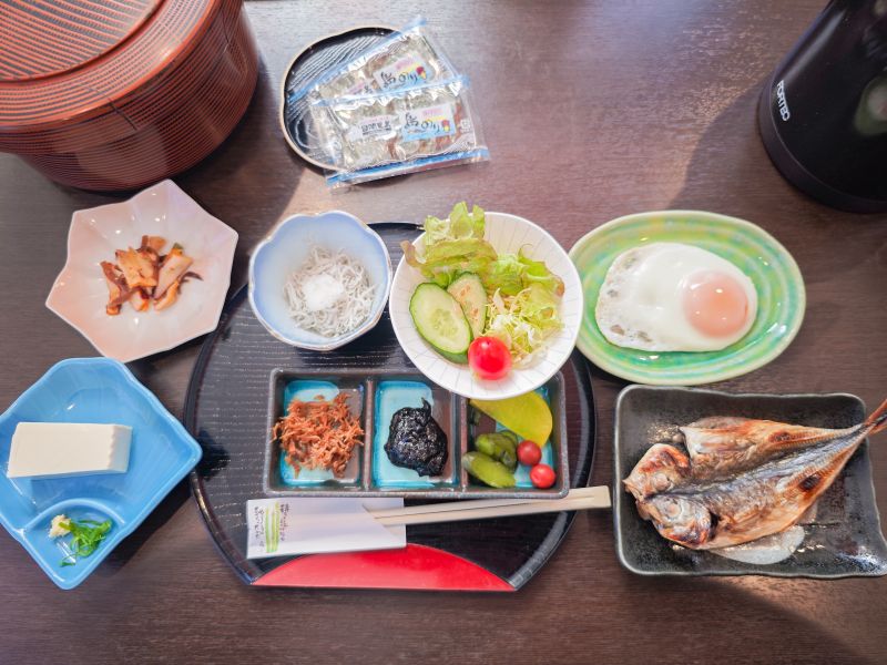 翌朝です。おひつに入ったご飯が朝から多いなと思っていたけど、米に合うおかずばかりでペロッとたいらげてしまいました。