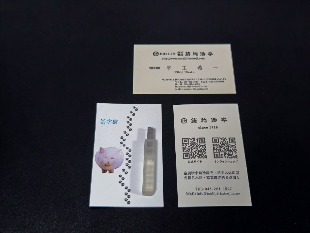 猫の足跡の活字と、ハンコのように手で押すためのホルダーがセットでした。このホルダーもオリジナルで、手軽に一文字の活字を押すのにぴったりです。