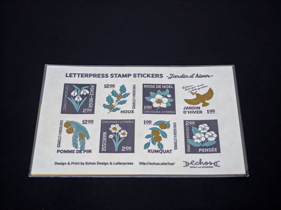 切手風デザインの活版印刷シールがかわいいので、手紙やサンクスカード等に使おうかと思います。ちなみにこちらのデザインは冬の庭シリーズで、左上からスノードロップ、ヒイラギ、クリスマスローズ、冬の庭、2段目に松ぼっくり、水仙、金柑、パンジーでした。