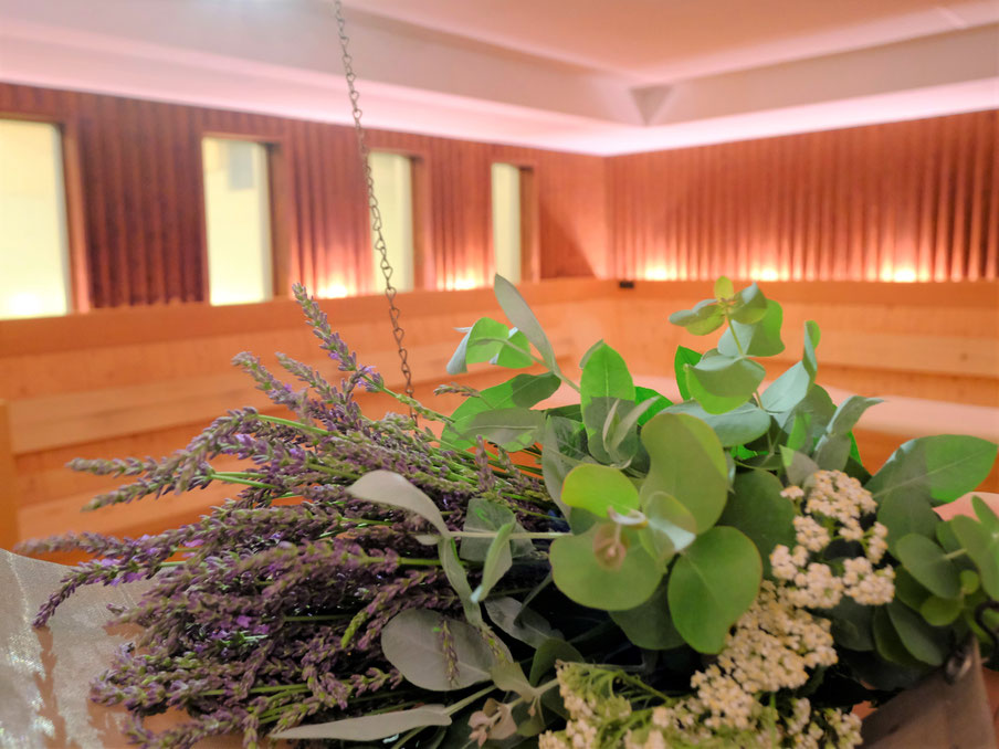 フィンランド式ロウリュの高温サウナで、香り高い薬草・ハーブがサウナ室内に充満しています。