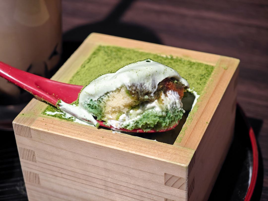 桝に入った贅沢な和風抹茶ティラミス。和カフェならではの粋な器と、抹茶とあんこがメインのティラミスは、甘いけどお茶の苦味がほんのりきいています。