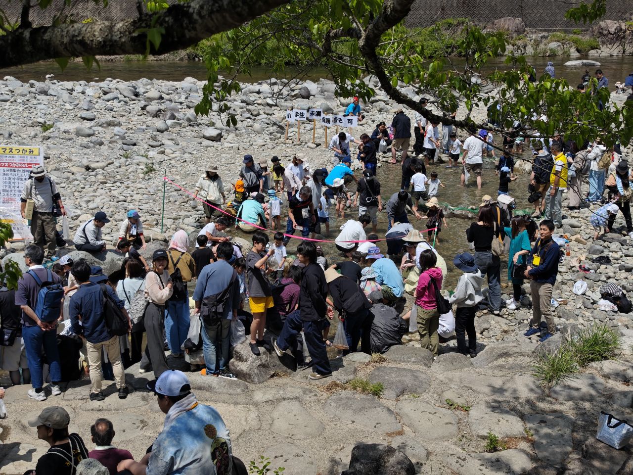 小学生以下限定のイベント。清流白川に放流されたマスをつかみ捕りして、炭火で塩焼にする体験。一人2匹まで捕まえてOKで、捕まえられなかった子には1尾プレゼントされるようです。