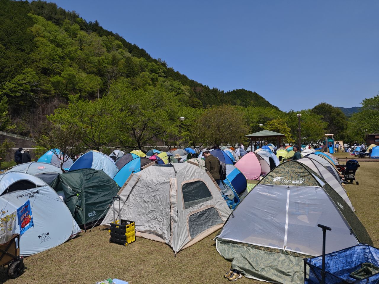 5月上旬とはいえ快晴だと暑く、会場内に日よけも少ないのでテントで休み人が多いのですかね。過去のイベントでテントを張る習慣ができていったのか。よくわかりませんが、とにかくところせましとみんなテントを設置していました。