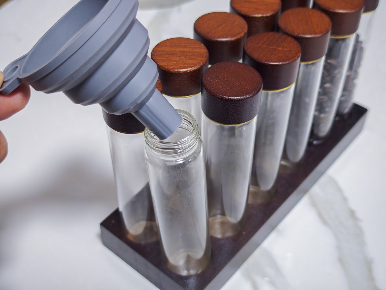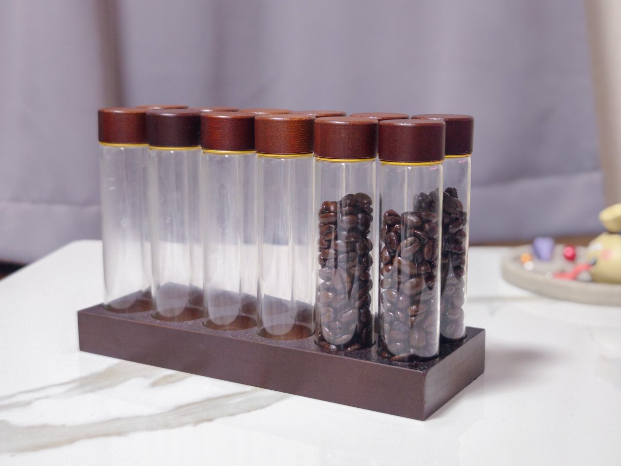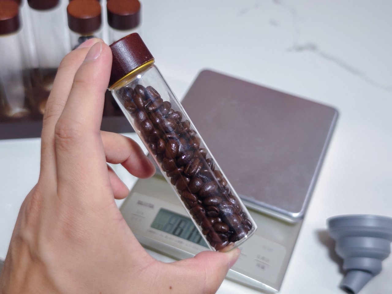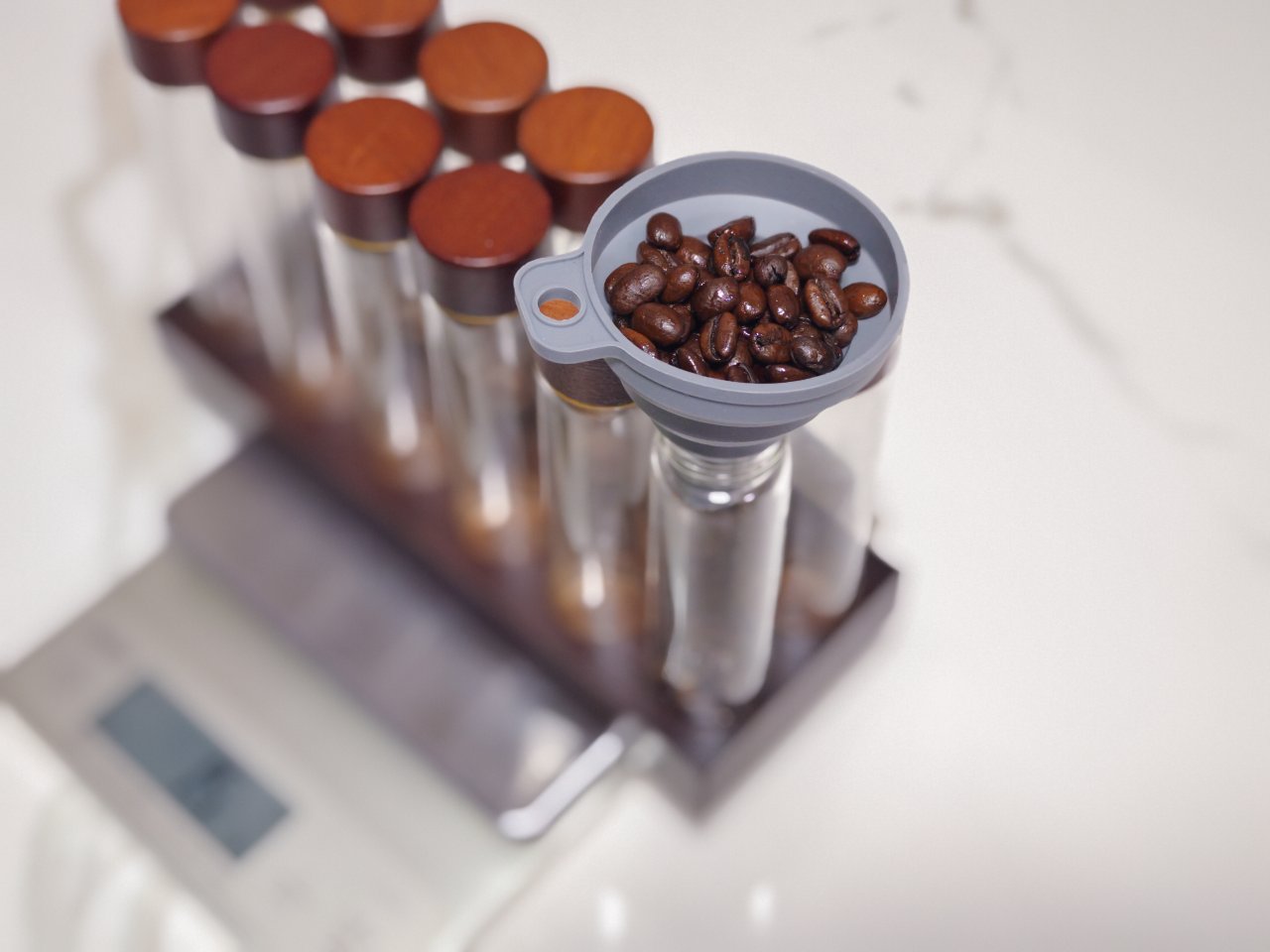 試験管風のガラス容器にコーヒー1杯分の豆を入れておき、必要な時にさっと取り出して使えるわけですね。この製品の場合、最大20gの豆を12回分ストックできます。
