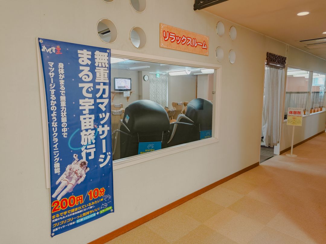 休憩所にはたくさんのリクライニングと、無重力マッサージチェアも設置。