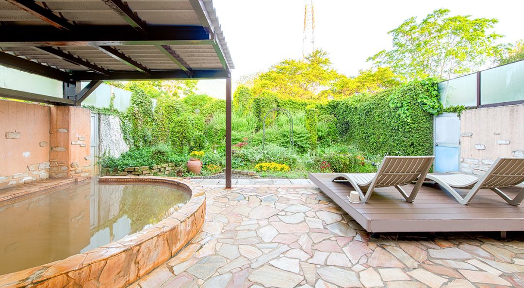 特に気に入ってるポイントが外気浴スペースです。リクライニングチェアが見えますが、実はその奥に散水用のシャワーがあって、腰掛ける前にシャワーで椅子をすすげるんですね。このワンアクションがめちゃくちゃ嬉しい。
